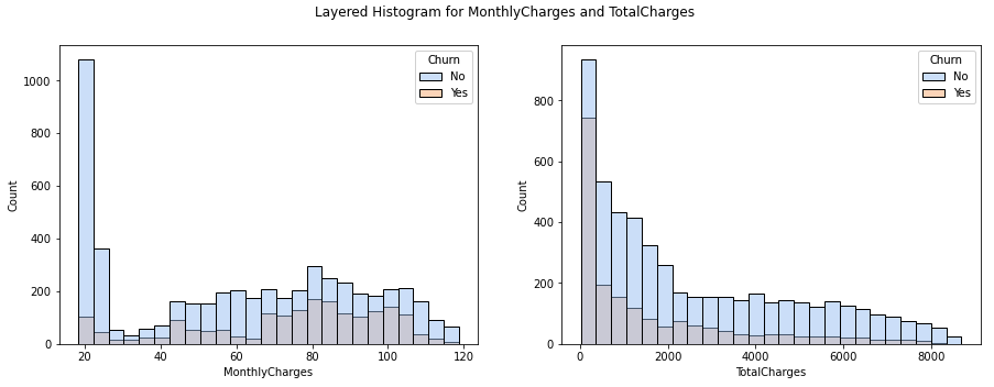We see that there is a negative correlation between churn rate and tenure. This suggests that the longer a customer has been with the company, the less likely the customer will churn. For MonthlyCharges and TotalCharges, we can compare the distributions using layered histograms.