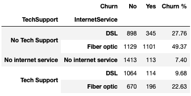 First we have the stratified contingency table of TechSupport and InternetService. Customers that have ‘No Tech Support’ and the ‘Fiber optic’ option of InternetService have a churn rate of 49.37%. That is pretty high and it may be worth the company looking into. On the other hand, customers that have ‘Tech Support’ and the ‘DSL’ option of InternetService have a churn rate of 9.86%. Why is there a low churn rate for this combination of features? Can something be learned from this and applied to customers that have ‘Fiber optic’ with ‘No Tech Support’?