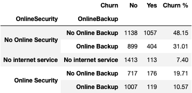 Next we have the stratified contingency table of OnlineSecurity and OnlineBackup. Here we see a stark difference between customers who have ‘No Online Security’ and ‘No Online Backup’ and customers who have ‘Online Security’ and ‘Online Backup’. Is there a way to encourage ‘Online Security’ and ‘Online Backup’ in order to lower the churn rate?