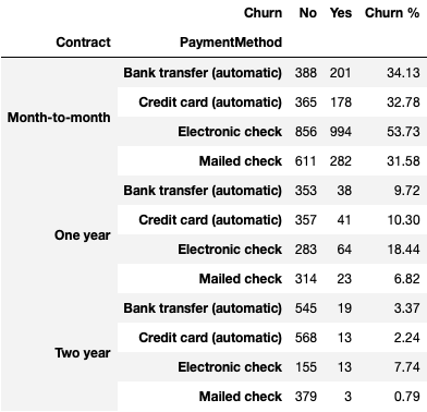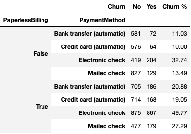 First we have the table for PaperlessBilling and PaymentMethod. We can see that there is an overall pattern of paperless billing leading to higher churn rates. Below we have the table for Contract and PaymentMethod. ‘Month-to-month’ contracts paid with ‘Electronic check’ have a high churn rate of almost 54% while the same contract paid with a ‘Mailed check’ has a significantly lower churn rate of 31.58%.