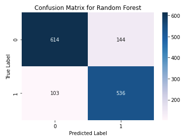 The accuracy on the test set is 82.32% and the f1 score is 81.27%. In the confusion matrix above, we see that that the true label ‘1’, or ‘Yes’, was incorrectly predicted as ‘0’, or ‘No’, 103 times. We also see that the true label ‘0’ was incorrectly predicted as ‘1’ 144 times.